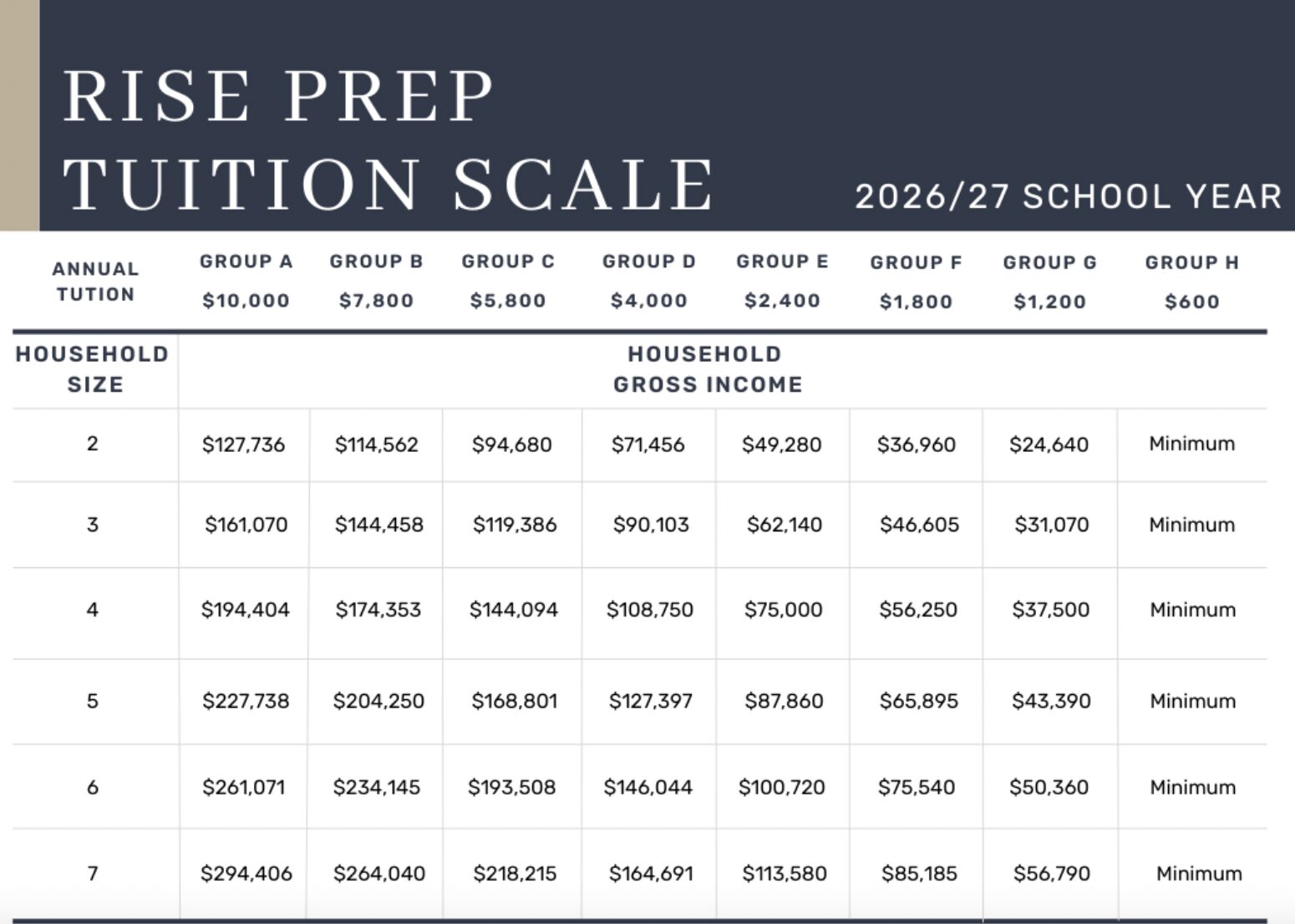 Tuition at Rise Prep is $30,000 annually, but all admitted families receive the Panther Scholarship awarded on a sliding scale based on household size and family income. This means the annual cost to the family for tuition ranges from $600 to $10,000 per year. You can find your family’s actual annual tuition by reviewing the Tuition Scale for the 2026/27 school year.